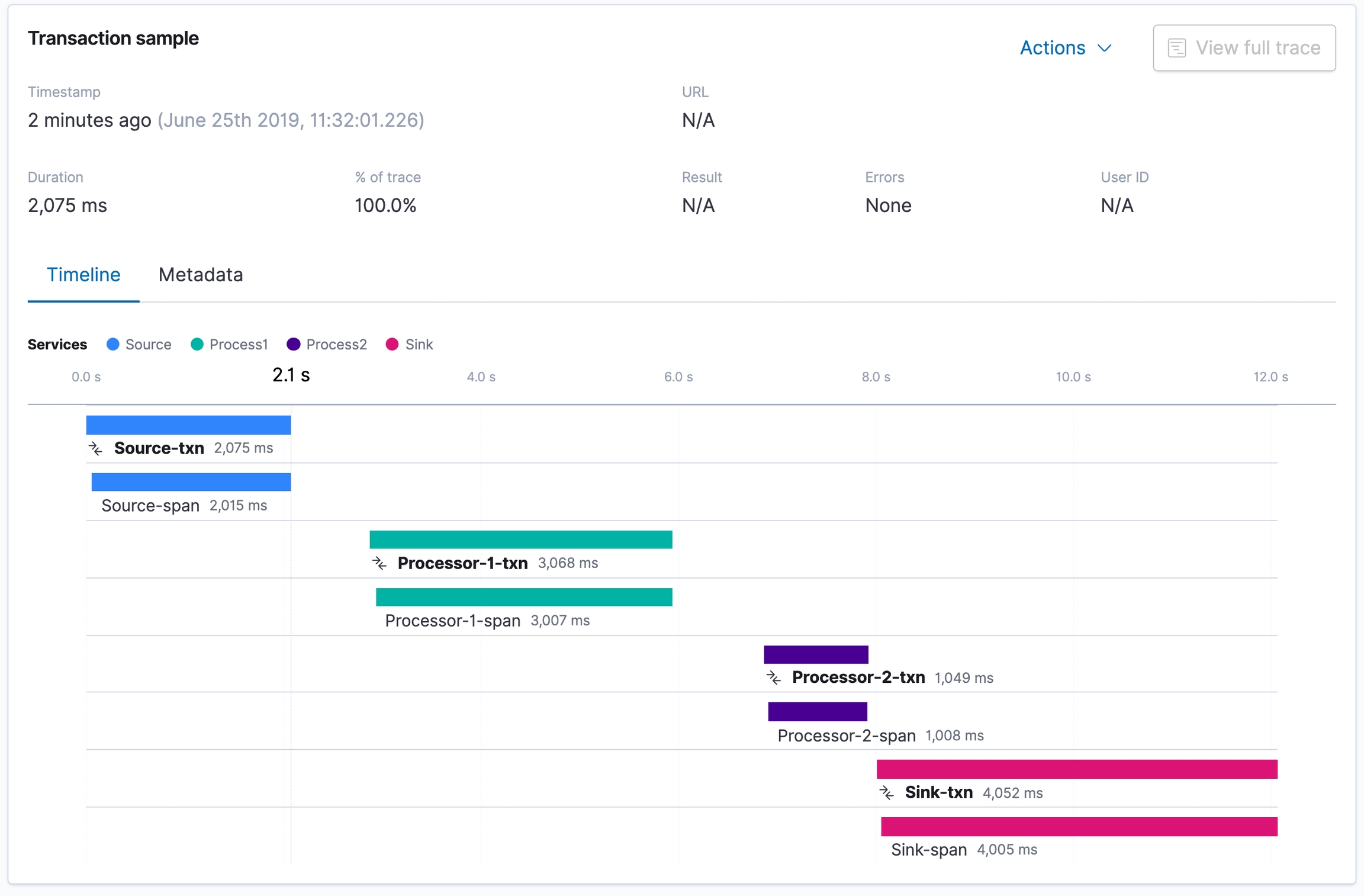 Whilst tracing is typically used in a request/response context where traces/spans stack hierarchically, it can also be used for monitoring unidirectional data flow: ie, for a pipeline.
