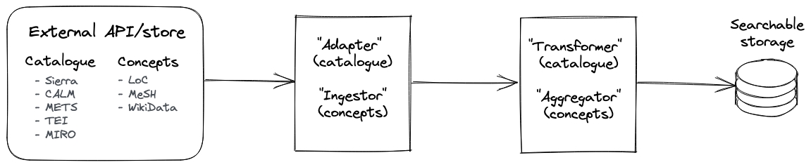 Both the catalogue pipeline and the concepts pipeline extract data from external sources, transform it, and load it into elasticsearch. They have similar architectures: